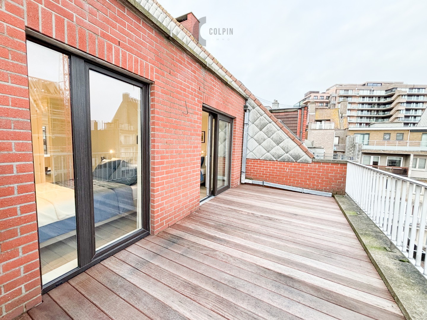 Penthouse gelegen in het centrum van Knokke met zijdelings zeezicht. Het appartement wordt momenteel gerenoveerd. Indeling: Inkomhal met gastentoilet. Royale woonkamer met open keuken. Uitgevend op een ruim en zonnig terras. Twee volwaardige slaapkamers met elk hun douchekamer. Achteraan opnieuw een zeer ruim en zonnig terras.
