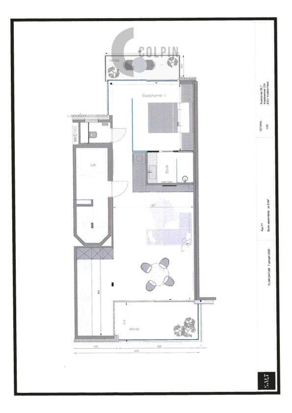 Indeling: Woonkamer met aansluitende keuken. Ruim terras vooraan. Slaapkamer met aansluitende badkamer. Gastentoilet. Ruim zuidgericht terras achteraan. Privatieve kelder. Twee fietshaken.