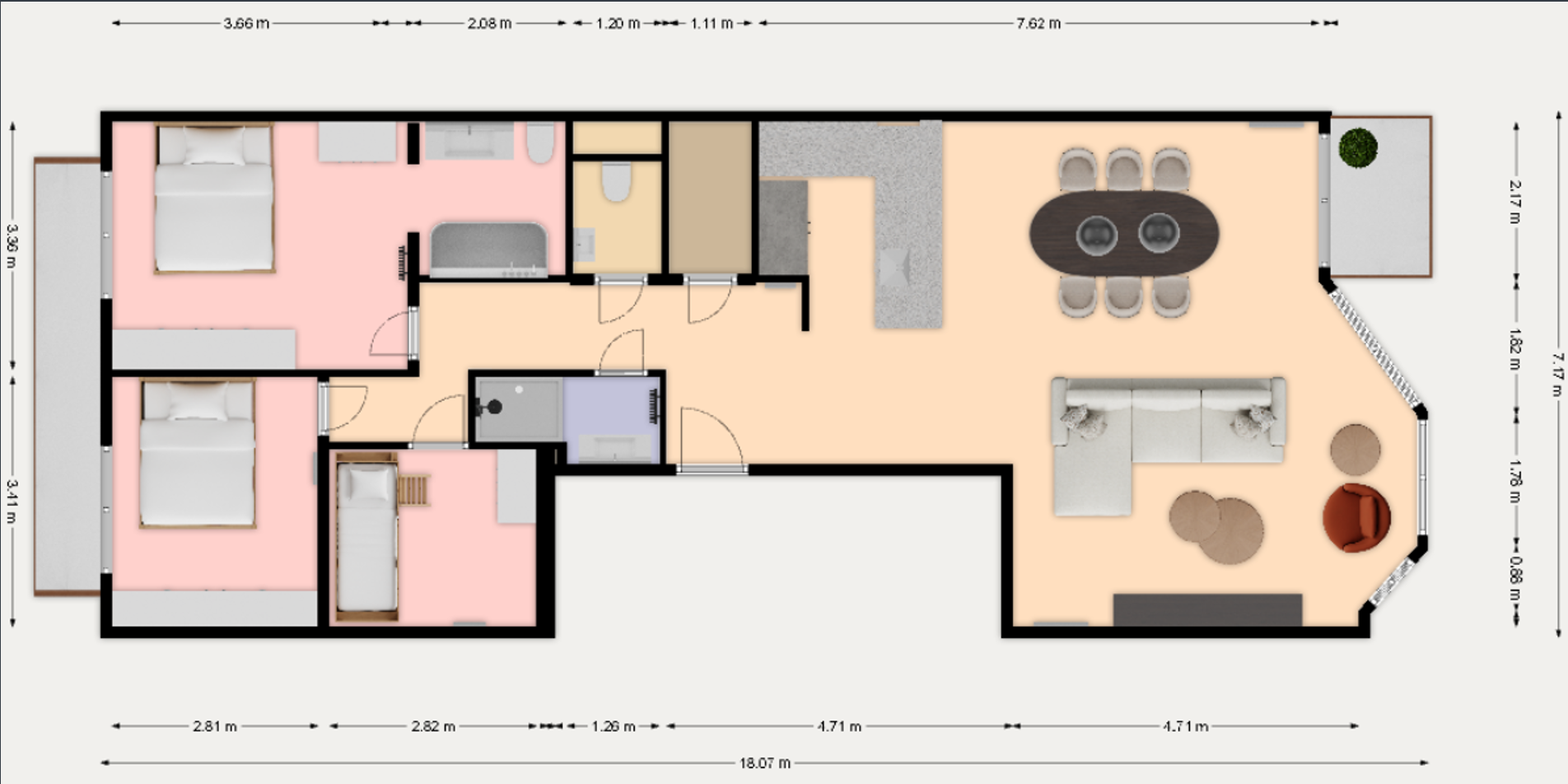 Daarnaast is er een derde slaapkamer (binnenkamer), voorzien van op maat gemaakte stapelbedden en ingebouwde kasten – perfect als kinderkamer of logeerruimte.